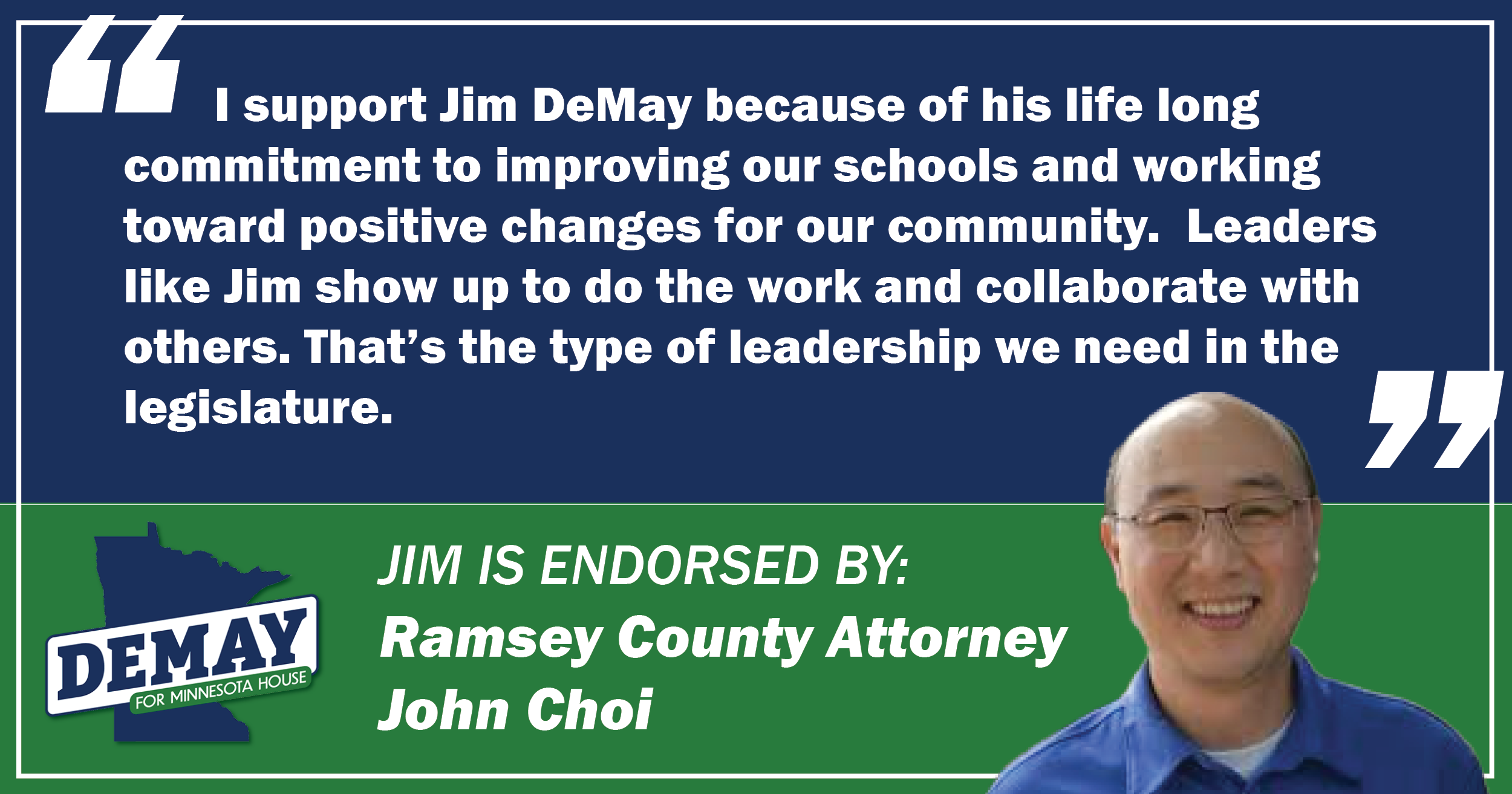 Jim DeMay is a 17-year resident of House District 36A, which includes the communities of Lino Lakes, Centerville, Circle Pines, North Oaks and White Bear Township. Jim grew up in neighboring Shoreview and graduated from Mounds View High School before receiving degrees from the University of Wisconsin-Madison and Hamline University, where he also served as an adjunct professor of business and public administration.